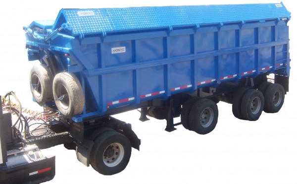 Semirremolque de 20 m3, con cierre hidráulico, diseñado para el transporte de lodos. Cuenta con dos compuertas que se abren para permitir la carga y luego se cierran para evitar derrames.